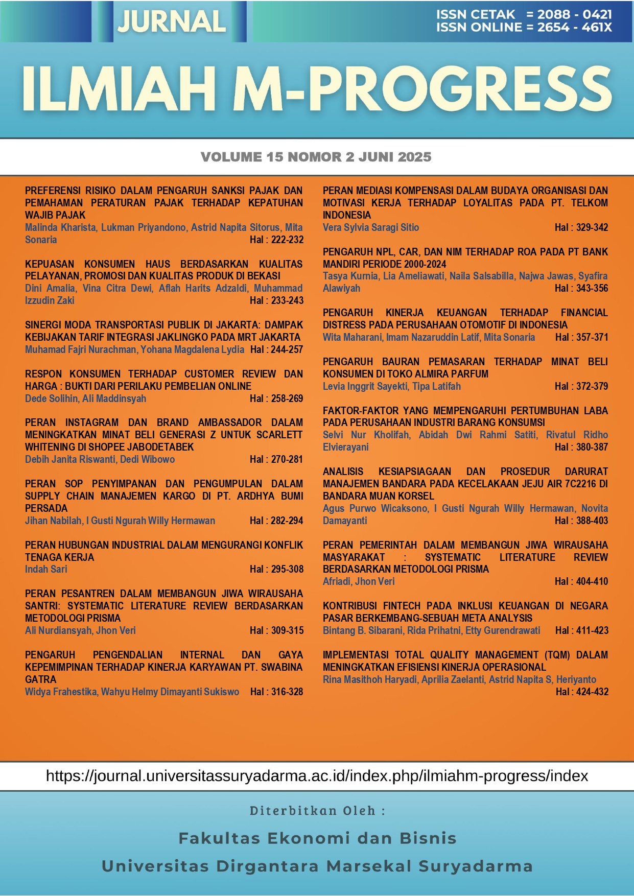 Jurnal Ilmiah M–Progress presents selected research articles in the fields of economics and management, covering topics in Marketing Management, Financial Management, Human Resource Management, Business Management, and Aviation Management. All articles published have undergone a rigorous selection and peer-review process to ensure scholarly quality and to contribute both theoretically and practically to the development of knowledge and contemporary issues in economics and business.
