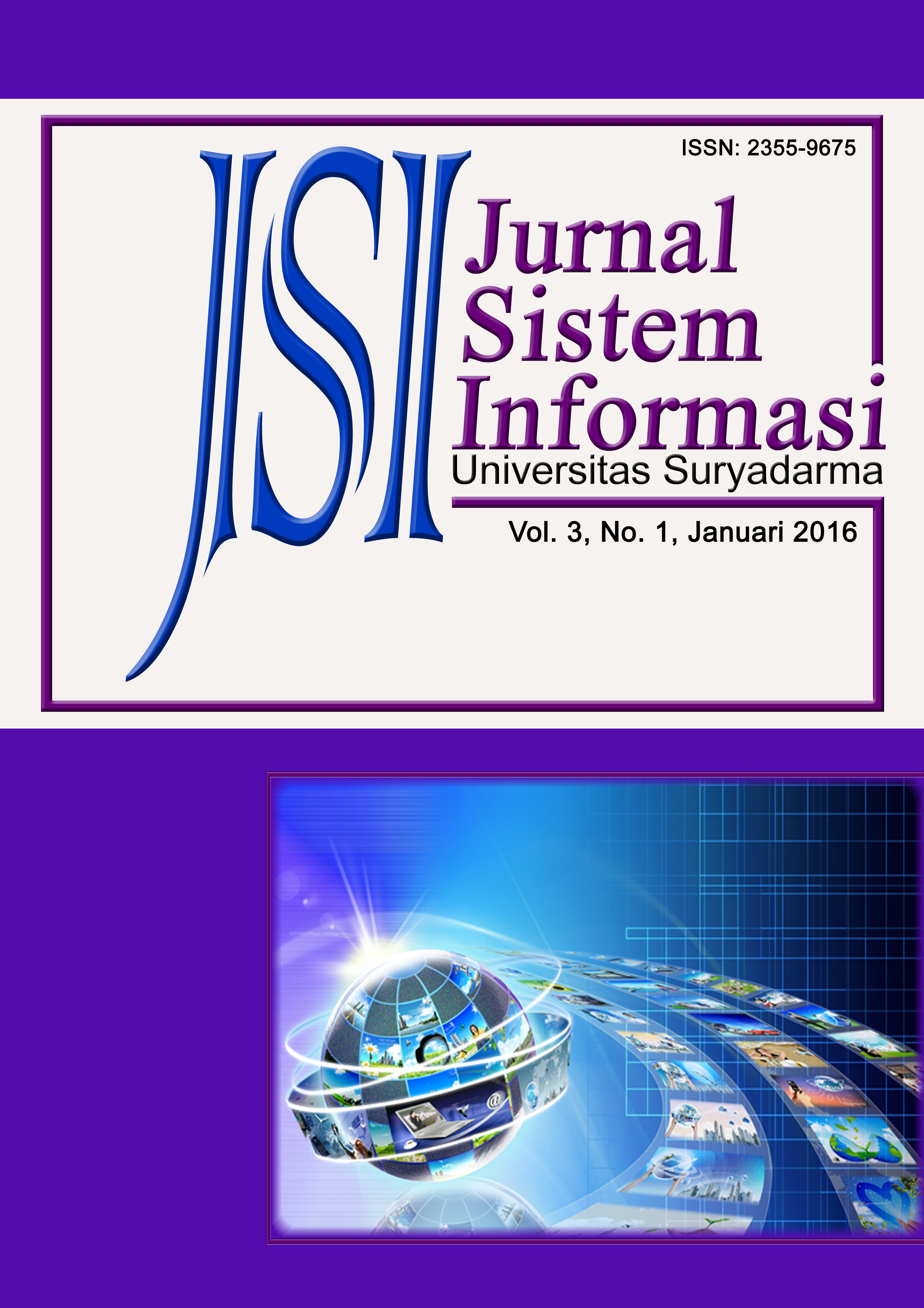 Vol 3 No 1 (2016)Jurnal sistem informasi adalah jurnal yang fokus pada sistem informasi yang diterapkan dalam dunia industri, pemerintahan, dan universitas. Semua artikel harus mencakup validasi dari ide yang disajikan. Misalnya melalui studi kasus, percobaan, atau perbandingan sistematis dengan pendekatan lain. Topik dari jurnal sistem informasi ini adalah semua yang berkaitan dengan bidang ilmu sistem informasi -