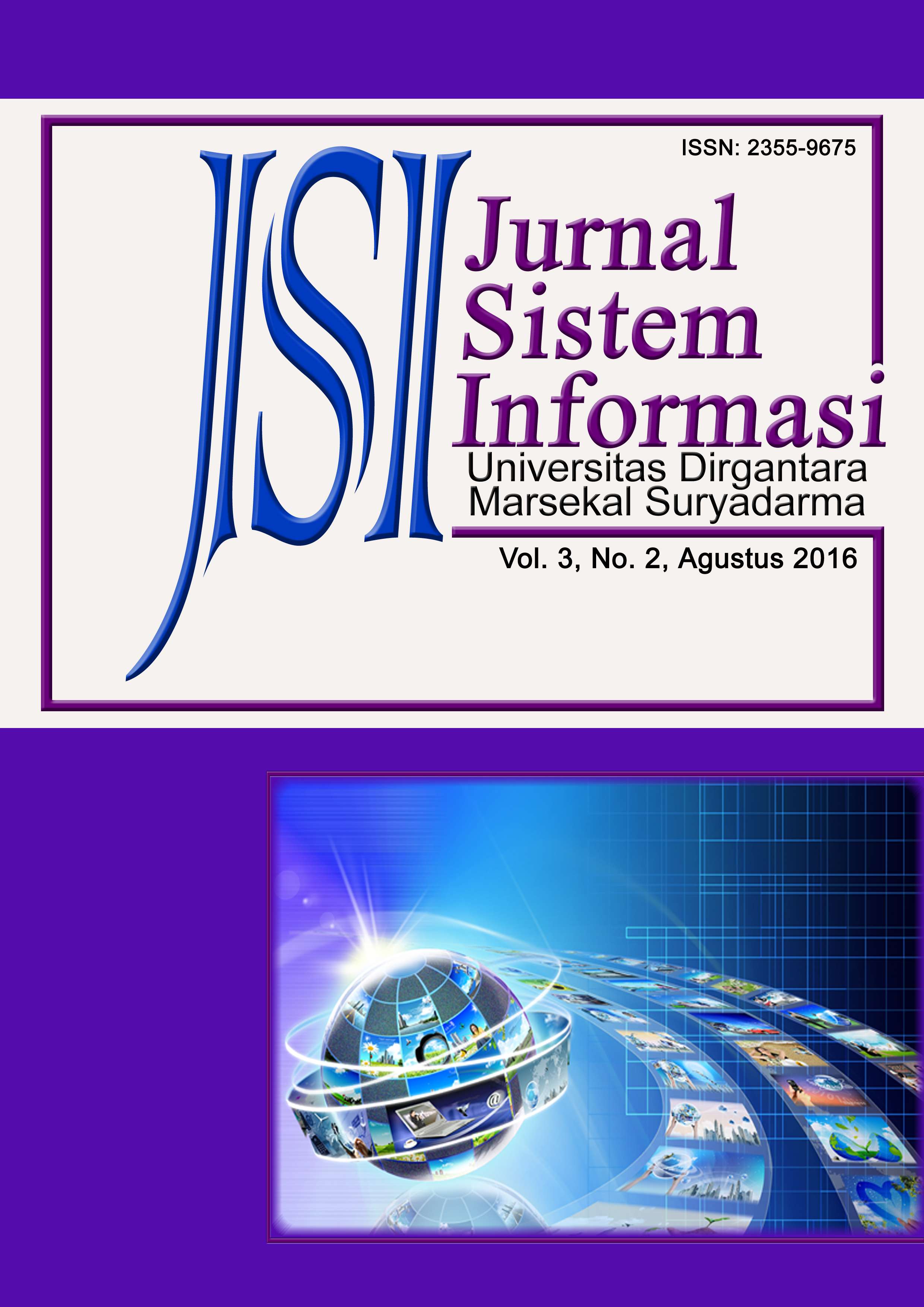 Vol 3 No 2 (2016)Jurnal sistem informasi adalah jurnal yang fokus pada sistem informasi yang diterapkan dalam dunia industri, pemerintahan, dan universitas. Semua artikel harus mencakup validasi dari ide yang disajikan. Misalnya melalui studi kasus, percobaan, atau perbandingan sistematis dengan pendekatan lain. Topik dari jurnal sistem informasi ini adalah semua yang berkaitan dengan bidang ilmu sistem informasi -