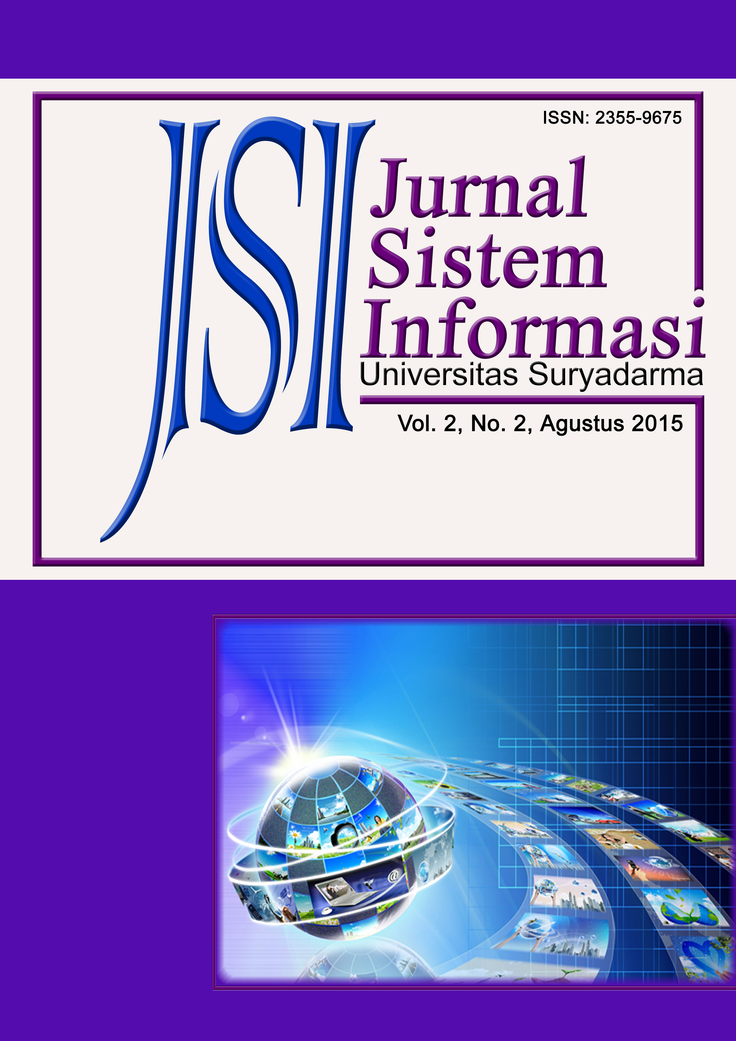Vol 2 No 1 (2015)Jurnal sistem informasi adalah jurnal yang fokus pada sistem informasi yang diterapkan dalam dunia industri, pemerintahan, dan universitas. Semua artikel harus mencakup validasi dari ide yang disajikan. Misalnya melalui studi kasus, percobaan, atau perbandingan sistematis dengan pendekatan lain. Topik dari jurnal sistem informasi ini adalah semua yang berkaitan dengan bidang ilmu sistem informasi -